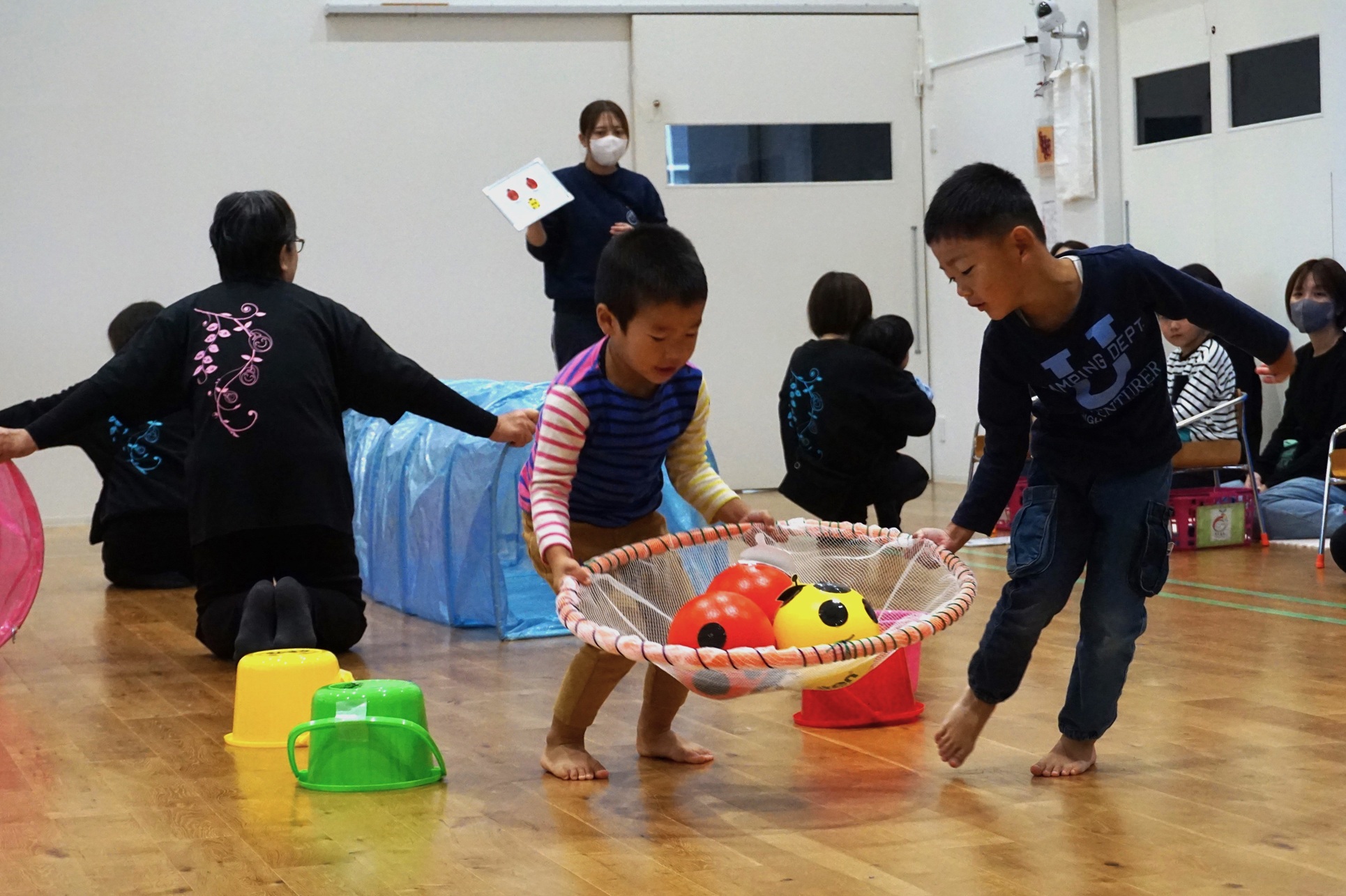 今年は、虫好きな子たちが多く、虫取りに見立てたてんとう虫レースを行いました。