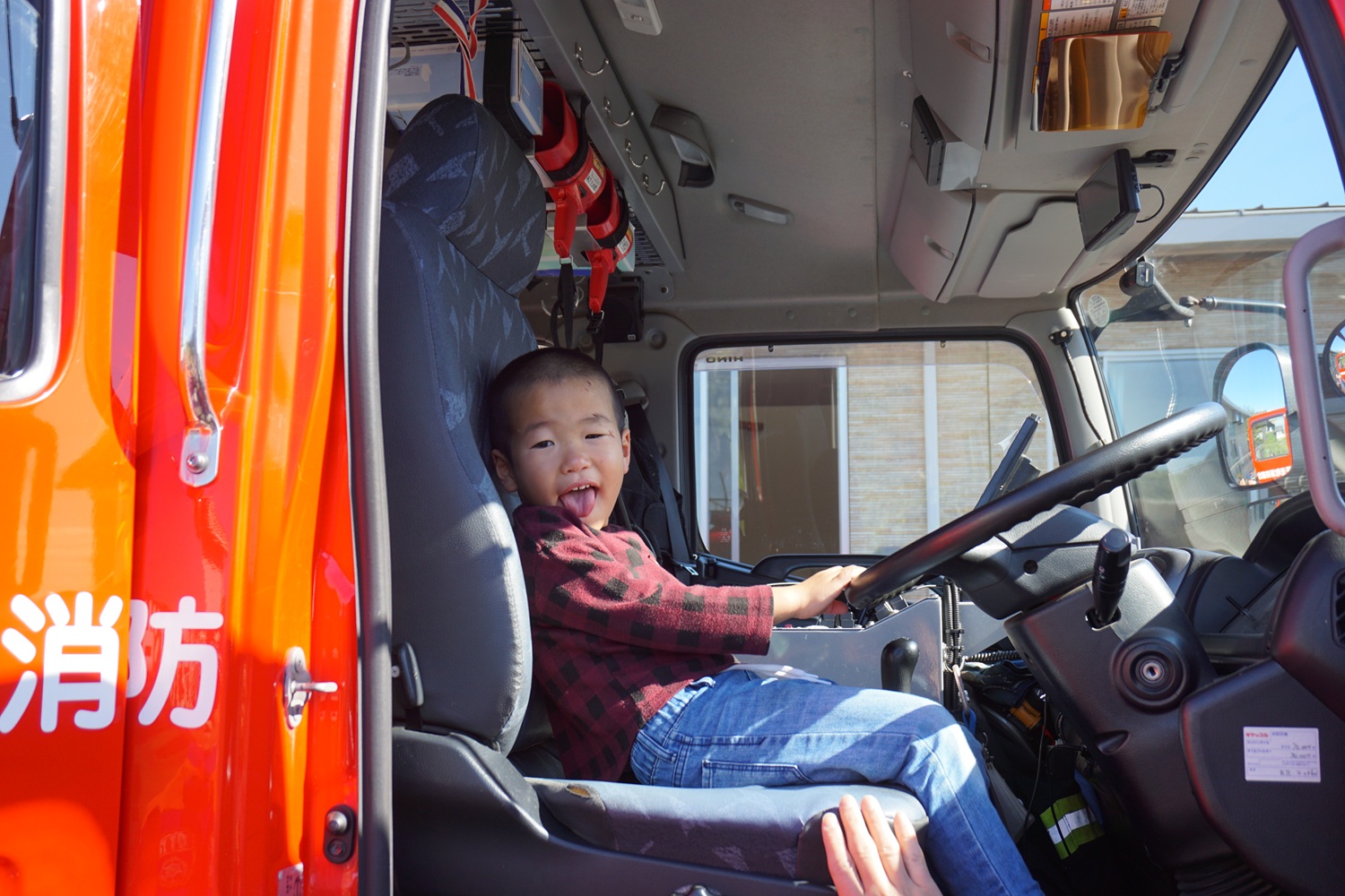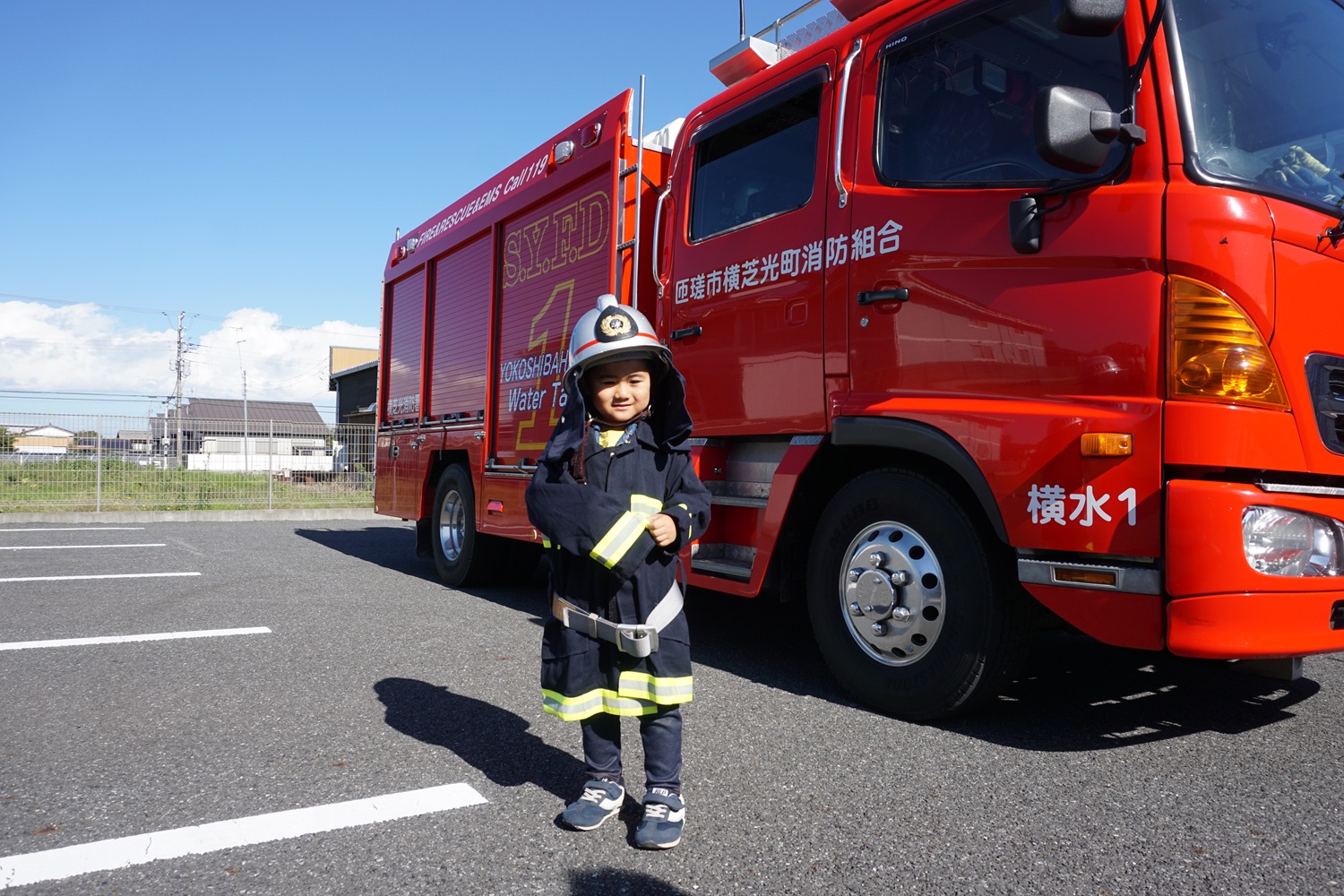 消防服を着させてもらったり、消防車に乗り写真を撮ったりと、